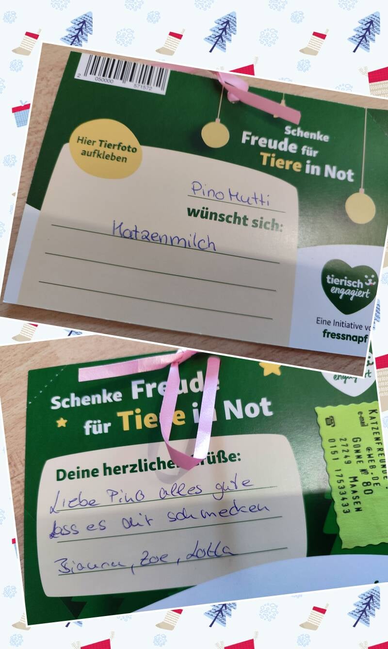 Wir haben es geschafft und haben neue Karten an den Baum vom Fressnapf gehangen oder vielmehr hängen lassen. Danke Inessa für deine Unterstützung. Wir sind überwältigt von der Spendenflut die uns dieses Jahr zu gute kommt.
